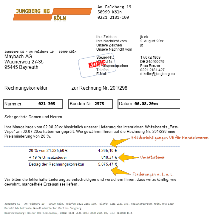 Ist eine Ausgangsrechnung gebucht, und kommt es nach der Buchung der Rechnung zu einer nachträglichen Preisminderung, so ist dem Kunden eine Rechnungskorrektur auszustellen.