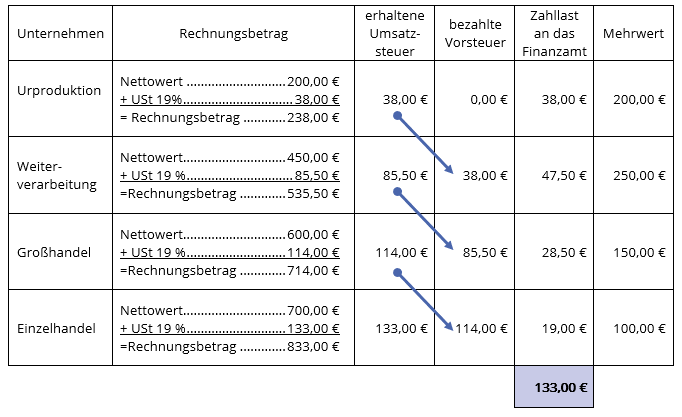 Die Summe der Umsatzsteuerschulden (Zahllast) der einzelnen Unternehmen beträgt 133,00 €. Dies entspricht der Umsatzsteuer, die der Endverbraucher über den Verkaufspreis an den Einzelhändler zahlt.  Der Endverbraucher trägt allein die Umsatzsteuer.