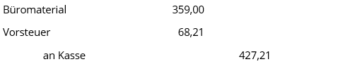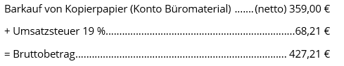 Der Bruttobetrag wird bar gezahlt, die Kasse reduziert sich um den Bruttobetrag. Da die Kasse, ein Aktiv-Konto, sich mindert, wird das Konto Kasse im HABEN gebucht. Dieser Betrag wird aufgeteilt in den Nettobetrag des Kopierpapiers und die darauf angefallene Umsatzsteuer. Der Nettobetrag wird auf dem Aufwandskonto Büromaterial im SOLL gebucht. Die darauf angefallene Umsatzsteuer wird auf dem Konto Vorsteuer ebenfalls im SOLL gebucht.