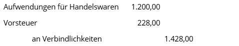 Der Bruttobetrag wird aufgeteilt in den Nettobetrag Handeslwaren und die darauf angefallene Umsatzsteuer. Der Nettobetrag und die darauf angefallene Umsatzsteuer werden beide im SOLL gebucht, der Nettobetrag auf dem Konto Aufwendungen für Handelswaren und die Steuer auf dem Konto Vorsteuer. Die Verbindlichkeiten, Passivkonto, erhöhen sich auf der HABEN-Seite um den Bruttobetrag.