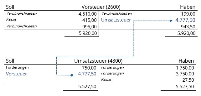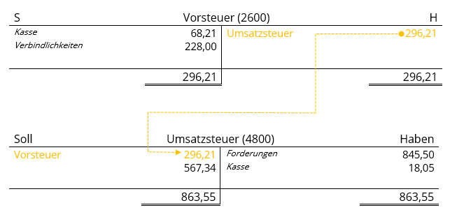 Der Saldo steht im Konto Vorsteuer auf der Haben-Seite und wird auf die Soll-Seite des Kontos Umsatzsteuer gegengebucht.