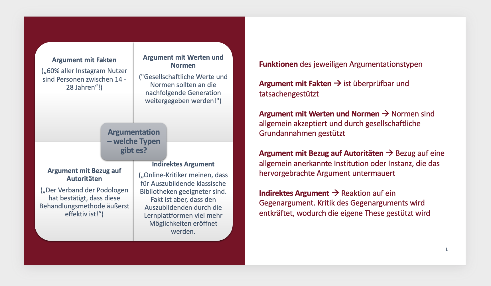 So, wie es verschiedene Fragetypen gibt, gibt es auch unterschiedliche Argumentationstypen! Es ist wichtig, den richtigen zur jeweiligen Situation zu wählen.