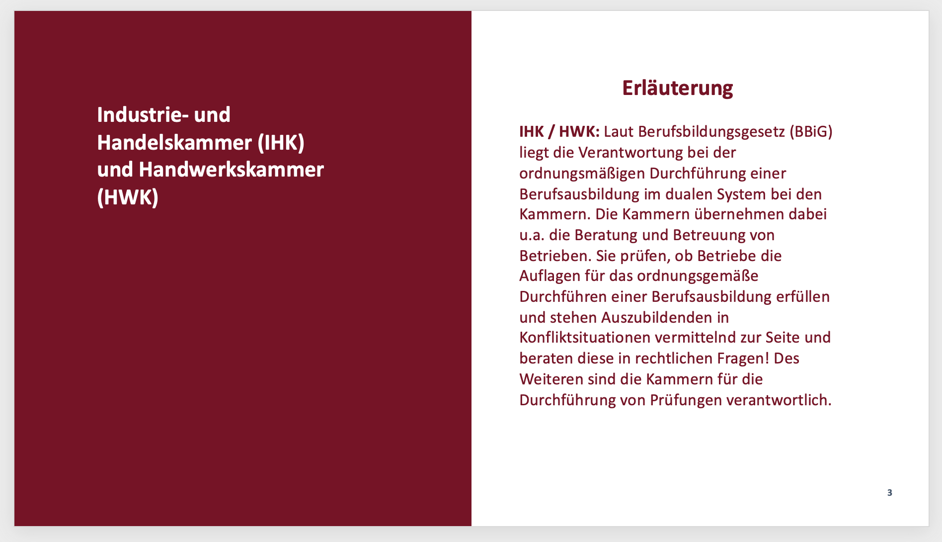 Während deiner Ausbildung wirst du mit einigen Institutionen und Interessenvertretungen in Berührung kommen. Die gesetzlichen Regelungen zur betrieblichen und schulischen Berufsausbildung sind komplex und liegen in den Aufgabenbereichen verschiedener Institutionen.