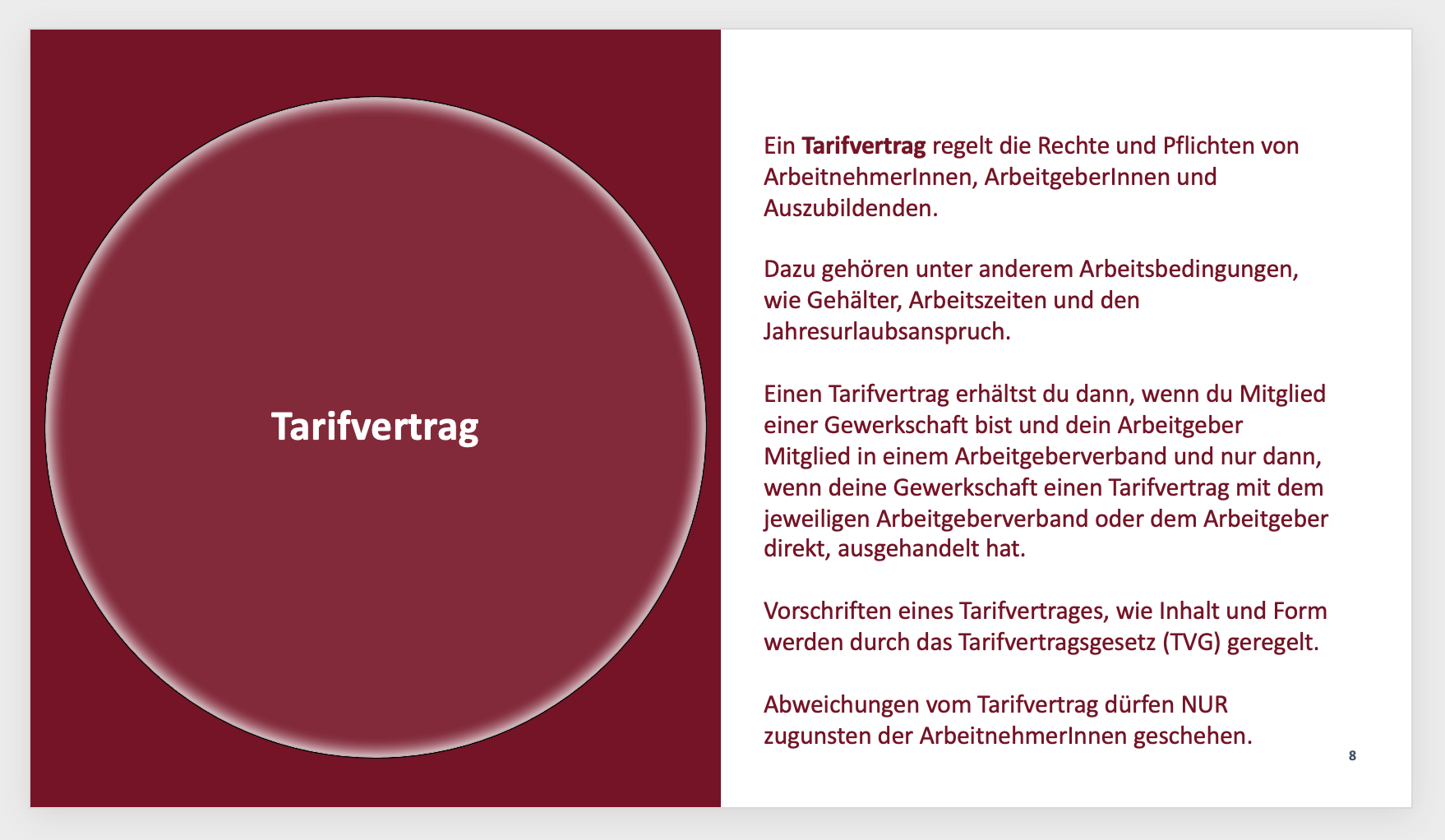 3. Manteltarifverträge - enthalten Rahmenbedingungen wie z.B. Arbeitszeiten, Anspruch auf Urlaub, Einstellungs- und Kündigungsbedingungen, sowie Kündigungsfristen, Krankheitsregelungen und Lohnzuschläge für z.B. Nachtschichten, Feiertagsdienst etc.